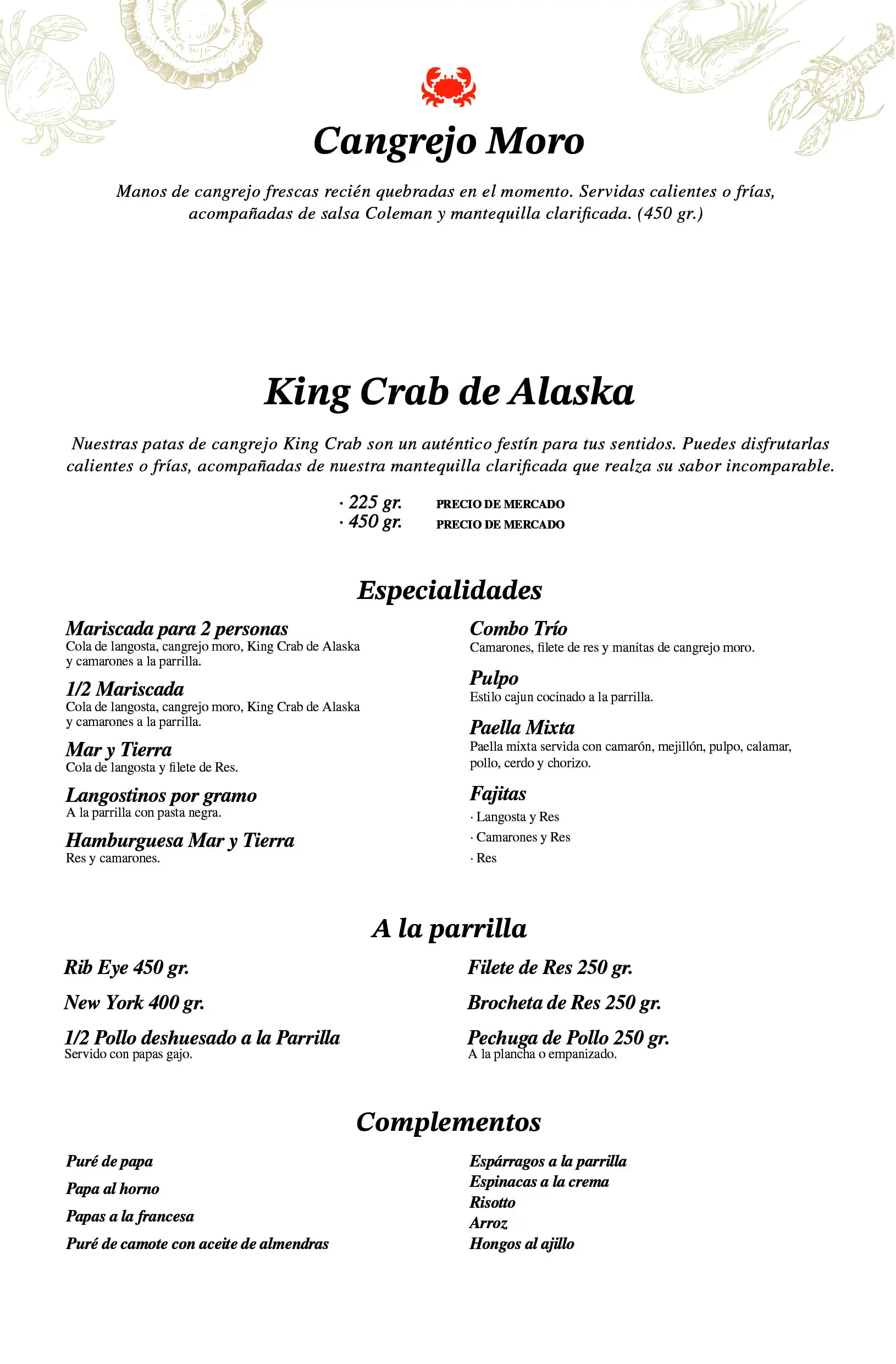 Nuestras patas de cangrejo King Crab son un auténtico festín para tu sentidos. Puedes disfrutarlas calientes o frías, vienen acompañadas de nuestra mantequilla clarificada que realza su sabor incomparable.